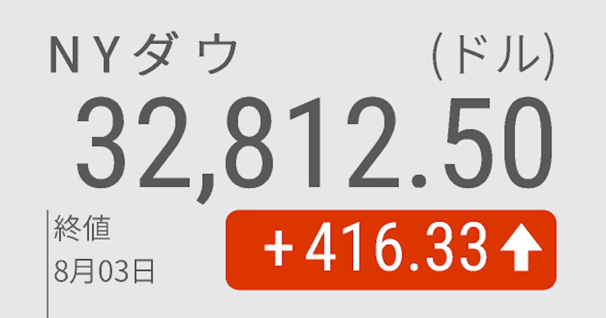 【NQNニューヨーク=横内理恵】3日の米株式市場でダウ工業株30種平均は3営業日ぶりに反発し、前日比416ドル33セント(1.3%)高の3万2812ドル50セントで終えた。3日に米サプライマネジメント協会(ISM)が発表した7月の非製造業(サービス業)景況感指数が市場予想に反して上昇し、米景気の底堅さが意識された。米中関係への過度の懸念がひとまず和らいだのも買い安心感につながった。