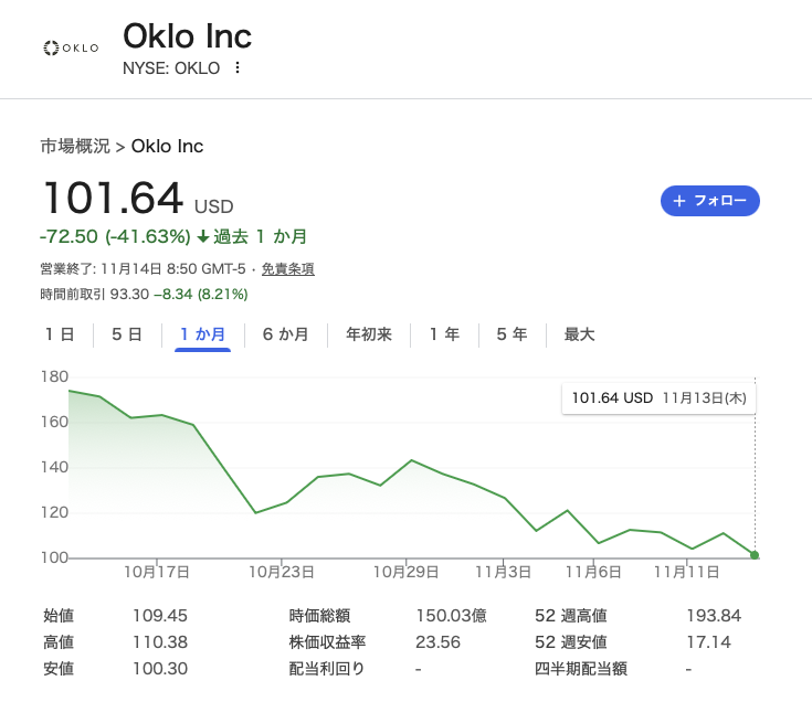 最近めちゃくちゃ上がっていて会社で話題になっていたOklo inc。何やらAIに対して原子炉で電力を供給するとかなんとか。SMRっていう小型原子炉の株も社内では話題になってました。まあ、どれも期待値だけがものすごく上がっている銘柄で危険だなぁって思ってました。メタプラとかもよく話題になってましたし被害者も出てました。