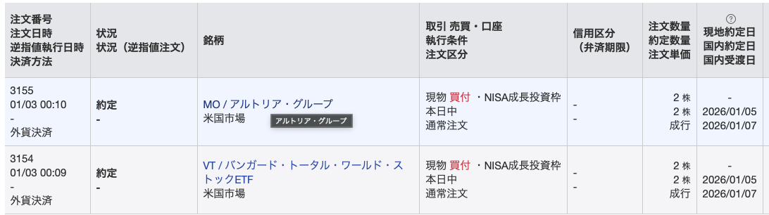 さて、年も明けてNISA口座が復活したので去年決済した資金で年初に積立枠の120万円を埋めてしまいました。さらに配当金が6万円ほどあったのでVTとMOと余った分はオルカンで買い付けをしていきたいと思います。BTIが30ドルくらいだったら再投資するのにちょうど良いんですけどなかなかうまくはいかないですね。